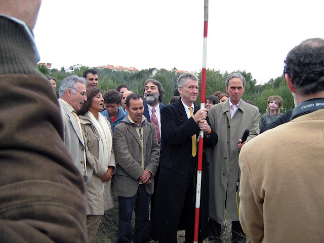 David Lynch, pela ocasião da Inauguração da Torre da Invencibilidade e Universidade Maharishi em Portugal (17 de Novembro de 2007). Ao seu lado esquerdo, Robert Roth, autor do livro "Meditação Transcendental de Maharishi Mahesh Yogi", editado em Português pela Pergaminho.